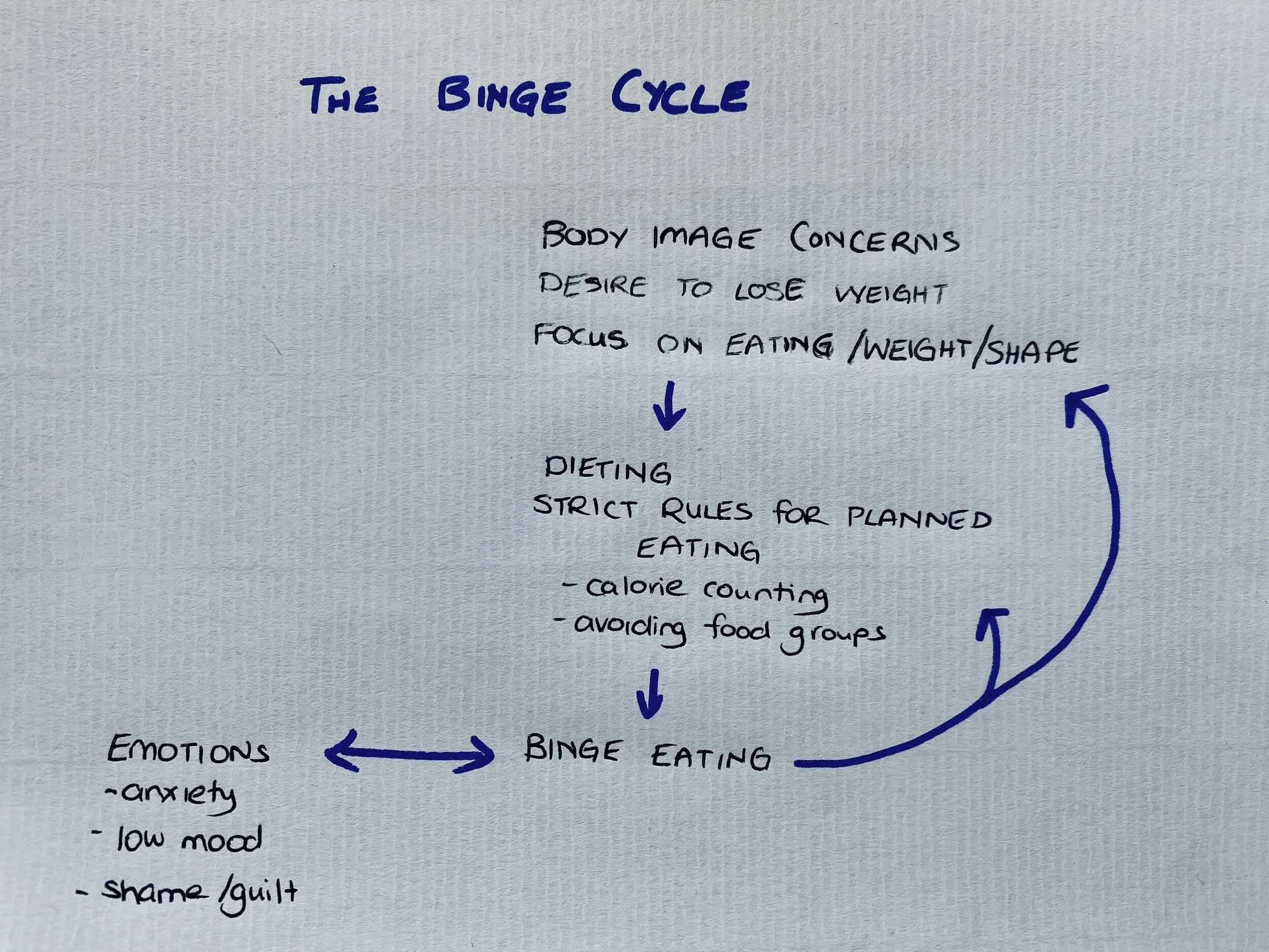 All of these forms of restriction make you vulnerable to binge eating. Not because you are “weak” or have “no willpower” but because our body is designed to become focussed on hunting out food when we are hungry. An evolutionary advantage when there was limited food available, becomes a difficult urge to manage in today’s society. The act of binge eating once again forms a vicious cycle, with people planning to compensate for bingeing by skipping a meal, dieting or planning to eat less tomorrow. It also often feeds into people feeling out of control of their weight and shape, or feeling bad about their body image. This further drives the urge to restrict (and the negative emotions), keeping you trapped in a vicious cycle.